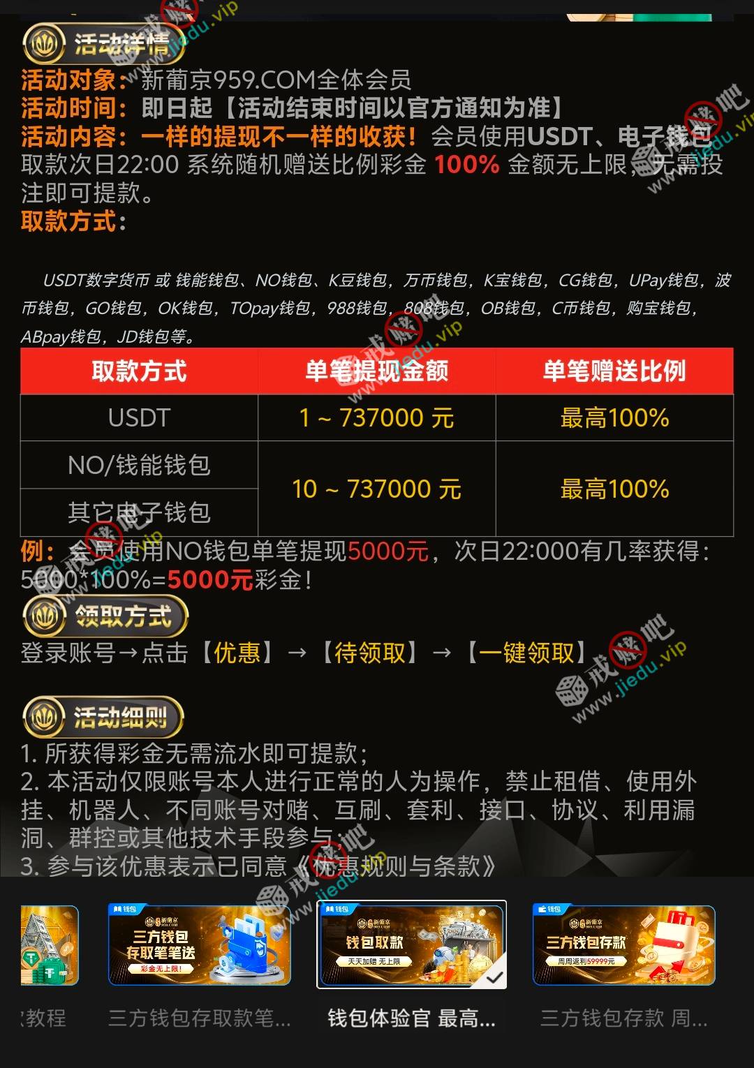 这个平台有个活动用钱包提款有几率百分百返利,我昨天晚上提了900,今天直接给我反了900彩金而且不需要流水就可以提款,太香了,这个平台我也玩了一年了挺稳的,而且基本上天天都有回馈,有想法的可以去看看