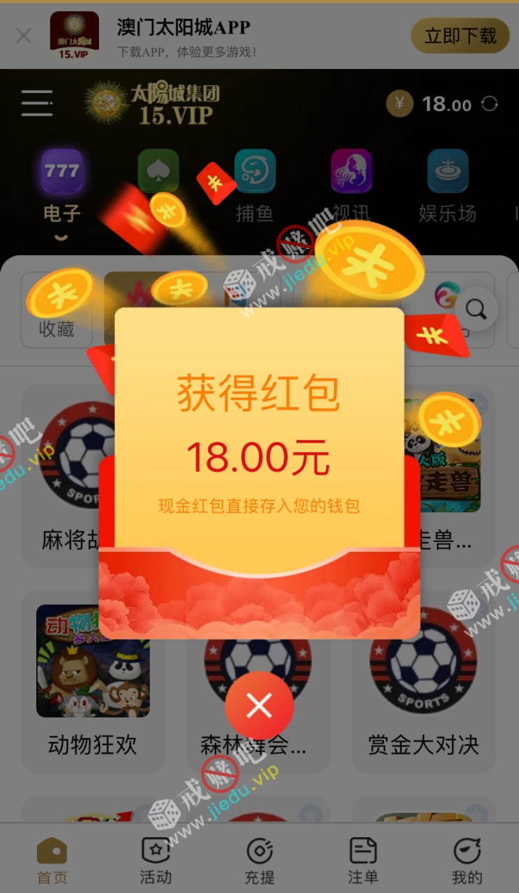 登录就无缘无故的送了 18,刚注册的,赌神们可以去碰碰。