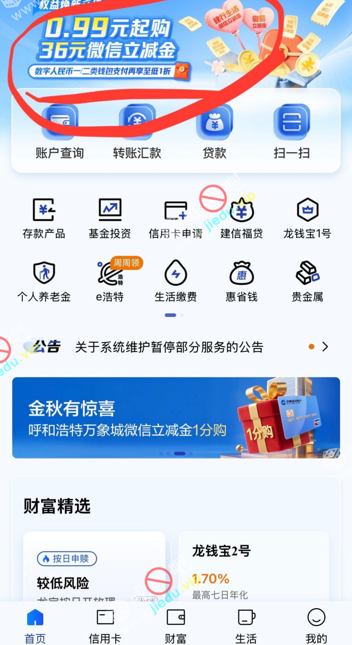 建行app首页上方横幅,抽折扣买立减金,合适的老哥可以试试,我抽到2.99元买到16块立减金,去看看吧。